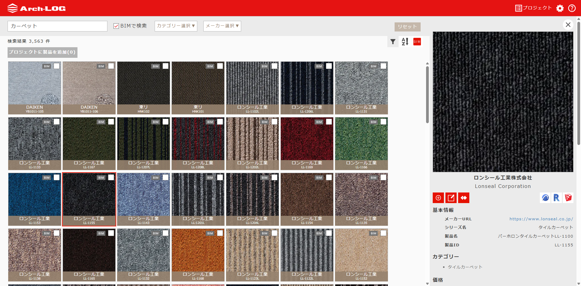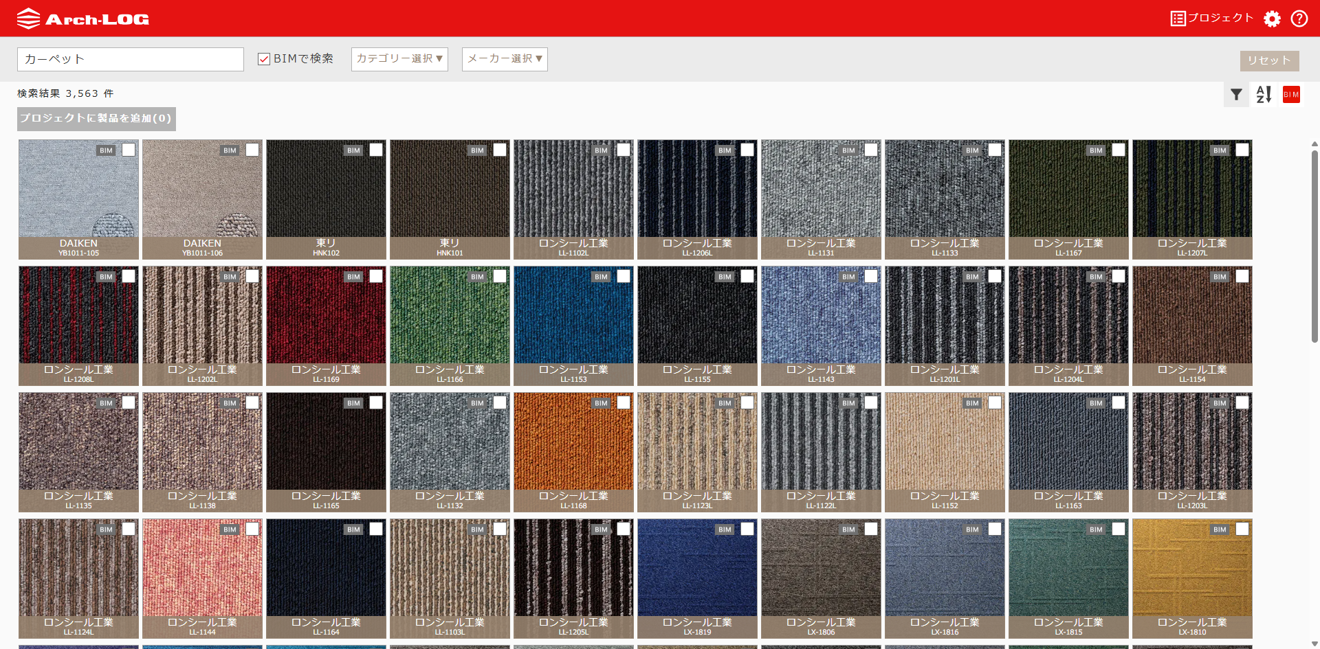 ※検索ボックス右横の「BIMで検索」にチェックマークを入れると、BIMデータが付帯されている製品が絞り込み表示されます。