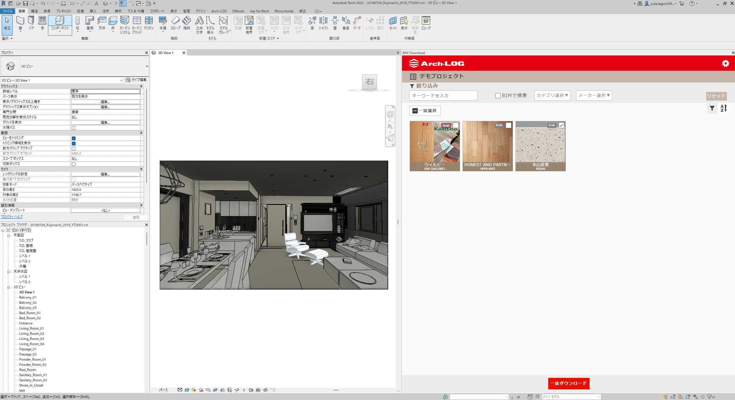 BIMデータがダウンロードできたか確認します。「マテリアル」はマテリアルブラウザで確認できます。
