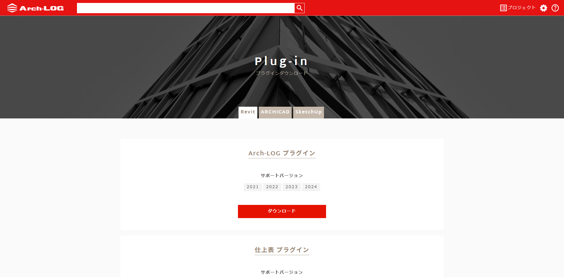 プラグインの画面でご利用のBIMソフトのタブを選択し、Arch-LOGプラグインのダウンロードボタンをクリック。ダウンロードしたプラグインをご使用のPCにインストールしてください。