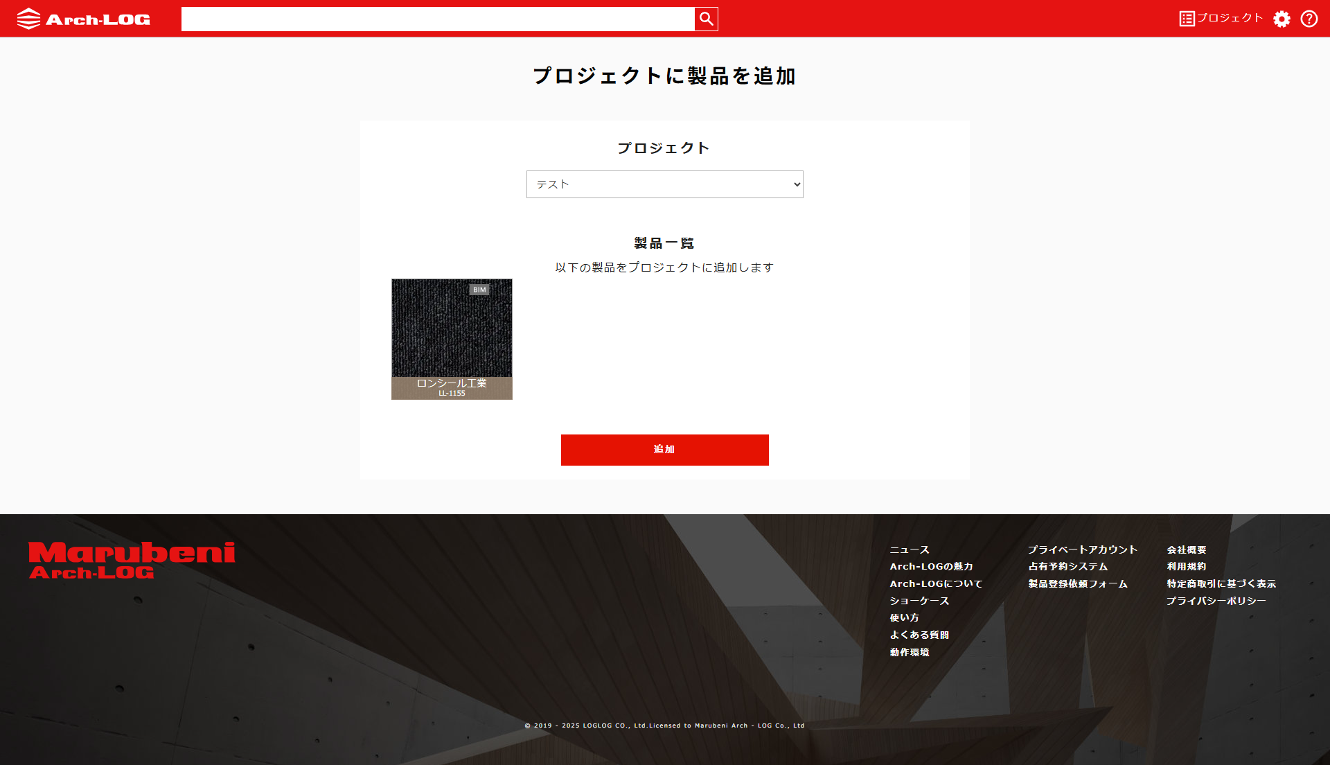 クリックしたBIM製品を追加するプロジェクトを選択し、追加ボタンを押します。